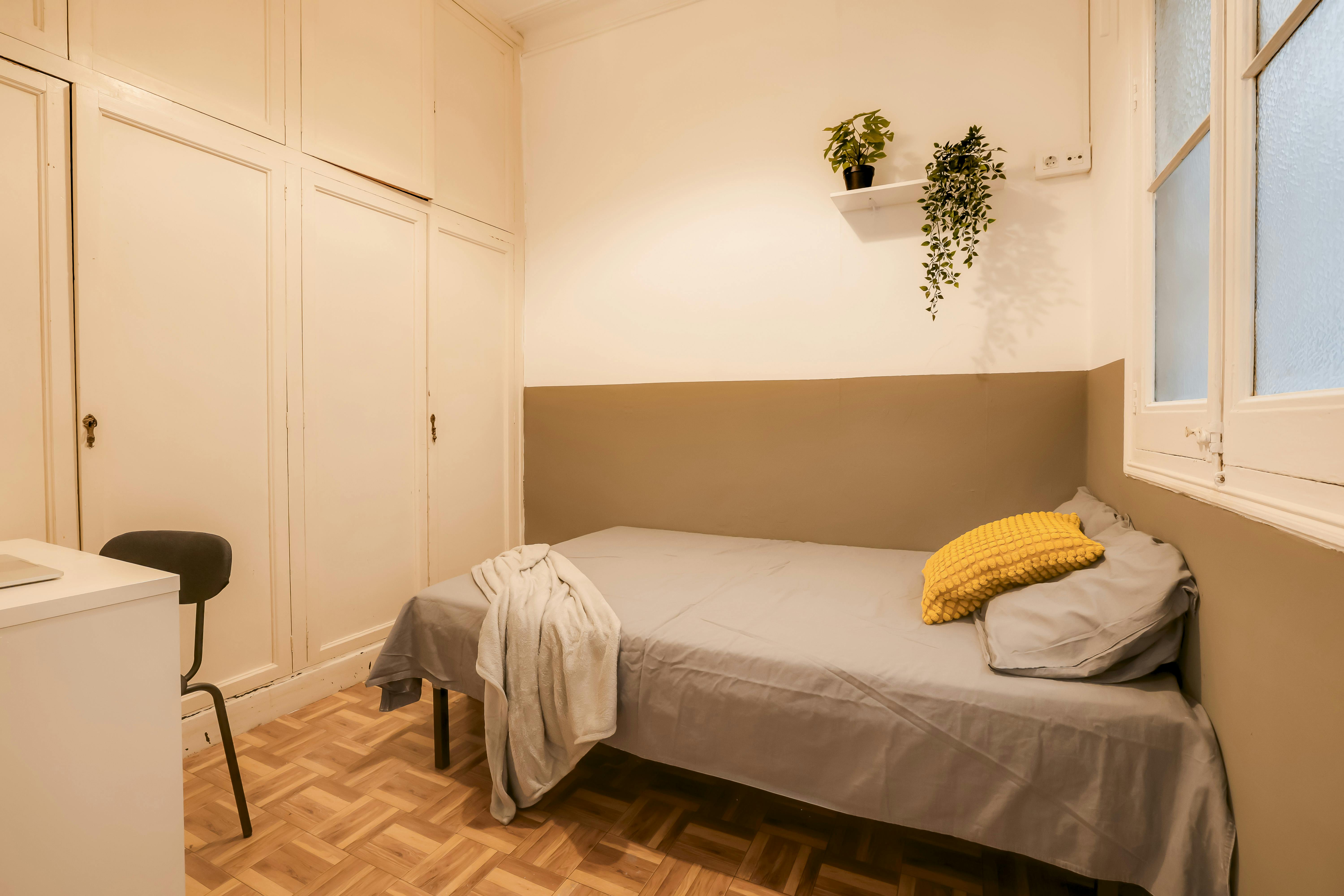 Brand new Co-Living flat Are you in search of a fantastic home where you can share experiences with co-livers from all around the globe? We’re excited to offer an inviting co-living space where international flatmates and young professionals aged 22 to 30 come together for more than just a room. Imagine sharing dinners, toasting with a glass of wine, enjoying beach volleyball, and even unwinding in a rejuvenating yoga class – all under one roof. Features at a Glance: As part of our coliving experience, we offer exclusive access to a coworking space in our office, perfect for working or studying in a comfortable and productive environment. Located in Plaça Catalunya. •Location: Prime spot in Eixample on Calle Aragó 109. •100m2 Flat: 6 rooms tailored to students and young professionals. •Comfortable Rooms: Each room comes complete with a double bed, desk, closet, and its own lock for privacy and security. •Bathroom Facilities: 1 full bathroom + 1 toilette shared among residents. •Weekly Cleaning: Enjoy a clean environment with 2 hours of cleaning service per week. •Room Rental Contract: Rest easy with a legal contract for your chosen room. Important: As this is a temporary rental, tenants must declare that they require the accommodation for a limited period and provide supporting documentation, such as proof of enrollment in studies, an internship agreement, a temporary work contract, or any other document verifying the temporary nature of their stay. Please Note: This Room is for a Single Occupant. Monthly rent + VAT + Bills (up to 60€ per person) + Cleaning at common areas: 600€ Security deposit: 600€ One-time service fee: 400€ Don’t miss out on this chance to be a part of our co-living community. Your next home awaits! For further inquiries or to arrange a viewing, reach out to us...